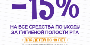С 25 августа по 7 сентября во всех бутиках «Нов-Денты» действует скидка 15 % на средства по уходу за гигиеной полости рта для детей и подростков до 18 лет!
