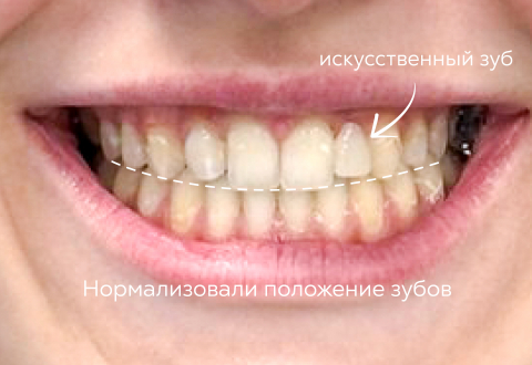 Так как на момент снятия брекетов пациентке исполнилось всего 16 лет, проводить имплантацию было ещё рано. Чтобы сохранить эстетику улыбки и подготовить базу для будущего имплантата, мы зафиксировали временный искусственный зуб на соседних зубах.