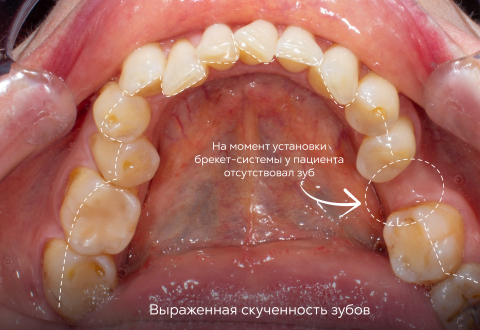 Пациентке 40 лет, она обратилась с выраженной скученностью зубов. Ситуация осложнялась давно отсутствующим 36-м зубом (нижняя шестерка). Когда в ряду есть пустота, соседние зубы постепенно смещаются в ее сторону, нарушая прикус и перегружая челюстной сустав.