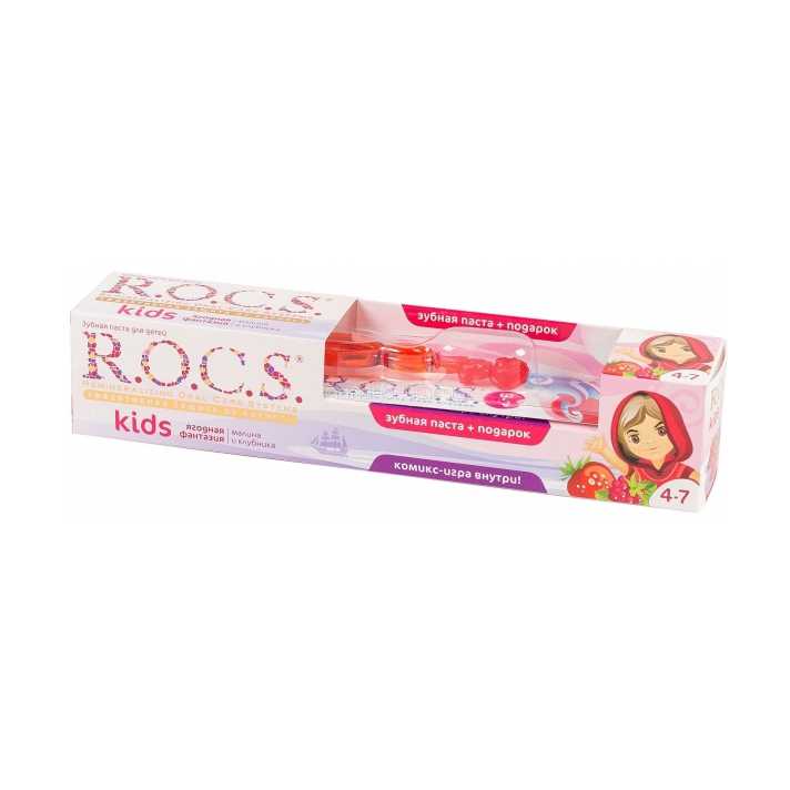Эффективная зубная паста R.O.C.S. Kids "Ягодная фантазия" со вкусом малины и клубники для детей от 4 до 7 лет разработана при участии стоматологов с учётом возрастных особенностей ребёнка.