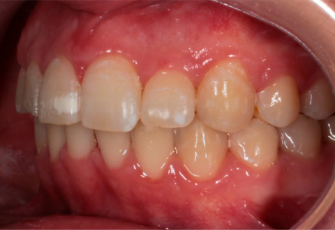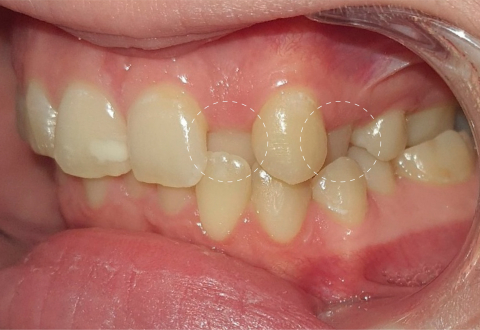 Пациенту, 22 года, было проведено ортодонтическое лечение серьёзной аномалии прикуса с помощью лигатурной брекет-системы, срок лечения 2,5 года.