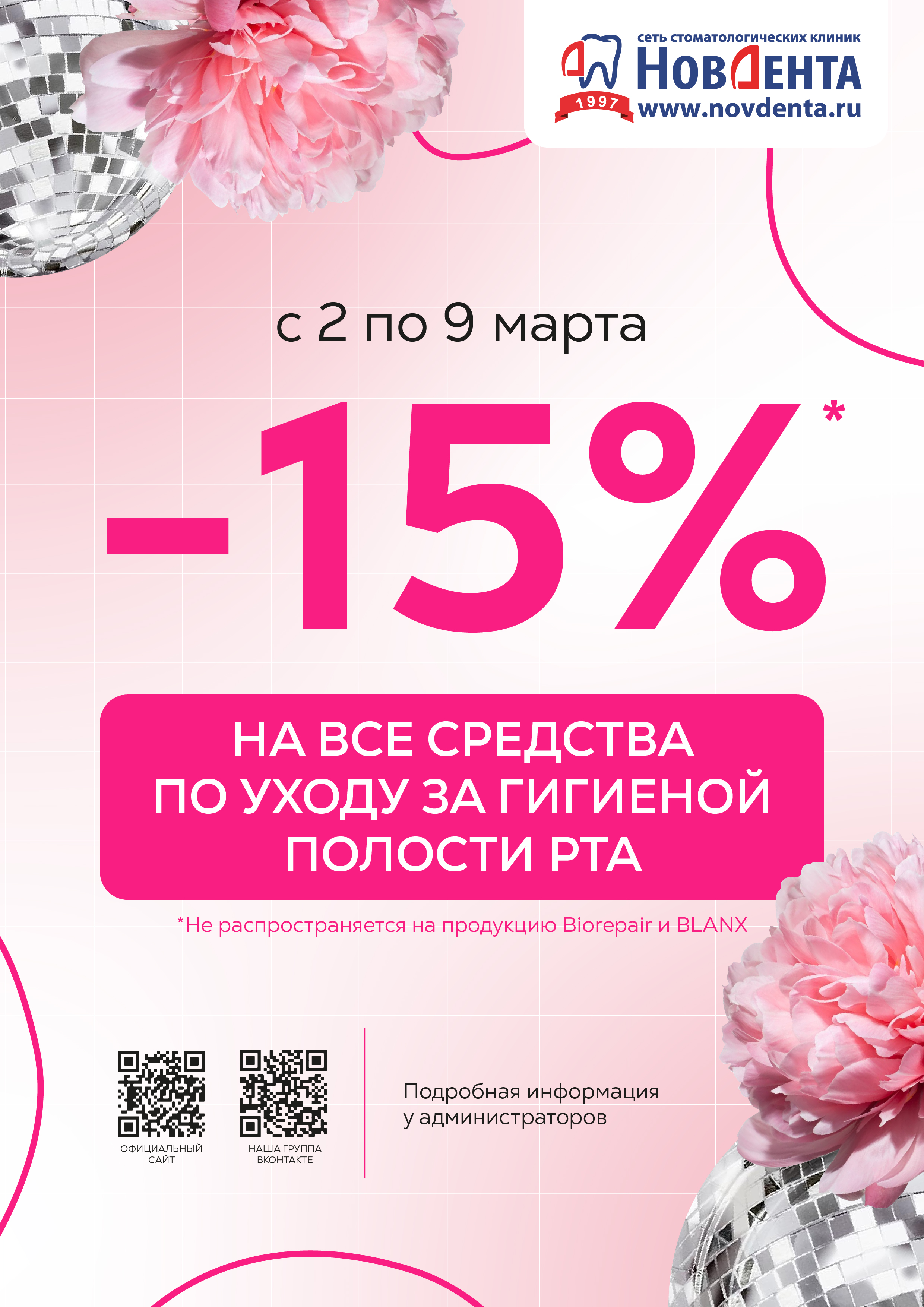 Совсем скоро 8 марта, а это значит, что в комплекте к тюльпанам полагается новая зубная щётка и любимая паста! Тем более, что со 2 по 9 марта в наших стоматологических бутиках Вы сможете сделать это по приятной цене. Отменяем "налог на розовое" и приглашаем всех мужчин за подарками для своих ненаглядных и сногсшибательных девушек!!!