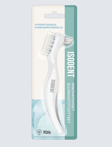 Высококачественная щетка для чистки протезов. Эргономичная ручка с противоскользящим покрытием предотвращает скольжение щетки в руке, а две чистящие поверхности позволяют быстро очистить всю поверхность протеза, в т.ч. узкие и труднодоступные места. Прочная нейлоновая щетина не повреждает поверхность протеза, независимо отматериала, из которого он изготовлен.