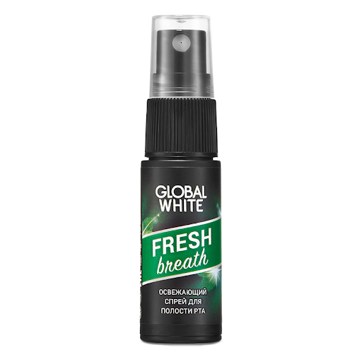 Всегда свежее дыхание! Деловая встреча? Романтическое свидание? Освежающий спрей GLOBAL WHITE - это компактный и удобный аксессуар, заменяющий 6 пачек жевательной резинки! Увлажнит слизистую оболочку полости рта, устранит неприятный запах изо рта после приема пищи, табака, алкоголя. Ментол придаст дыханию аромат свежести и прохлады. Натуральные экстракты оливы и петрушки сократят количество бактерий, вызывающих неприятный запах изо рта, предотвратят кариес и воспалительные процессы в деснах.