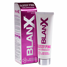 Blanx Pro Glossy Pink - отбеливающая зубная паста для ежедневного использования, содержит экстракт исландского мха и отбеливающие ферменты папаин и бромелайн.