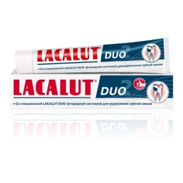 Зубная паста Lacalut Duo, 75 мл. Со специальной Lacalut Duo-фторидной системой для укрепления зубной эмали. Регулярное использование зубной пасты Lacalut Duo является эффективным методом профилактики кариеса. Благодаря специальной сбалансированной комбинации фторида натрия и аминофторида достигается быстрое проникновение и насыщение зубной эмали фтором. Способствует длительной и эффективной реминерализации и укреплению эмали, повышает её резистентность к развитию кариеса.
