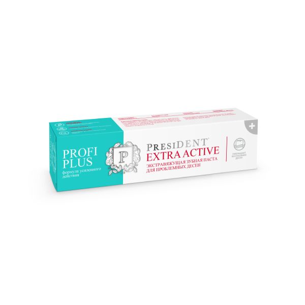 PRESIDENT Extra Active - экстравяжущая зубная паста для зубов и десен. Комбинация лактата алюминия, хлоргексидина (0,1%) и экстракта коры дуба обеспечивает экстравяжущий эффект, который проявляется в течение 10-15 минут после применения. Эффективен для снятия кровоточивости даже в сложных случаях.