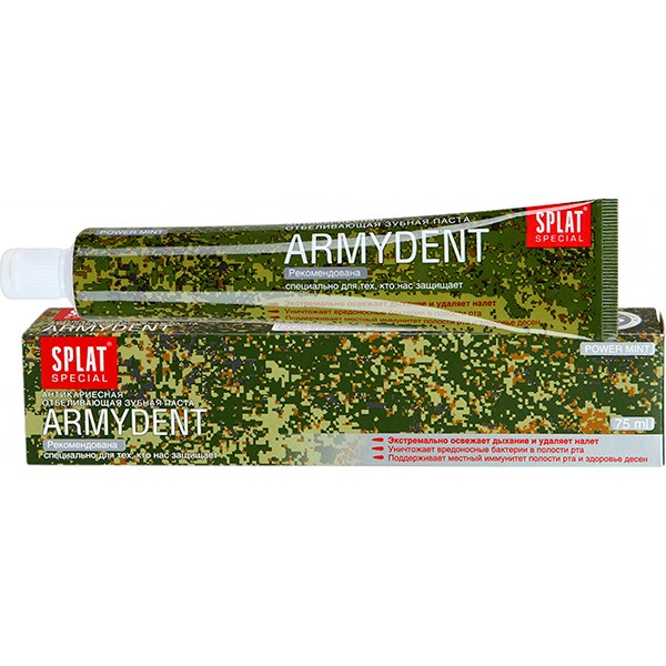 Отбеливающая зубная паста Splat "Armydent" предназначена для использования в экстремальных условиях: на полигоне, в походе, в экспедиции, на охоте или рыбалке.