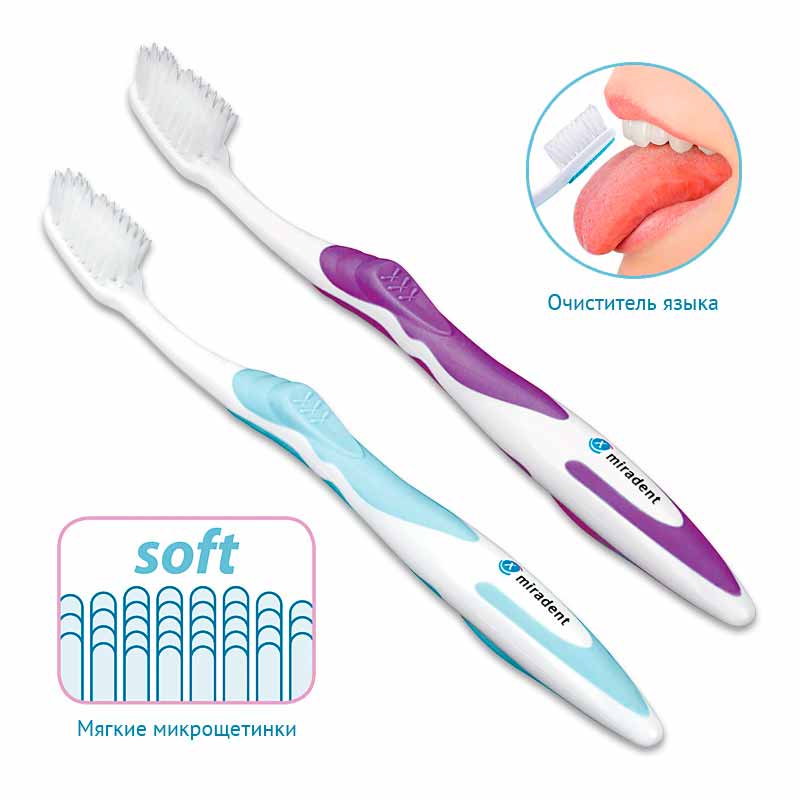 Зубная щетка Miradent Carebrush Supersoft подходит людям с высокой чувствительностью зубов и десен. Также стоматологи рекомендуют использовать ее в послеоперационный период. Мягкие щетинки аккуратно счищают зубной налет, не повреждая ткани ротовой полости.